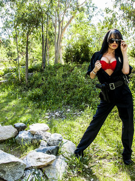 Полицейская с искусственными титьками снимает с себя униформу и трусики на природе
