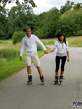 На берегу водоема телка в очках сношается с мулатом и его белым другом
