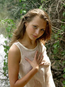 Чарующая блондинка на фоне молодого леса показывает свое тело