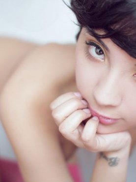 Привлекательная азиатка в розовых чулочках позирует обнажённой